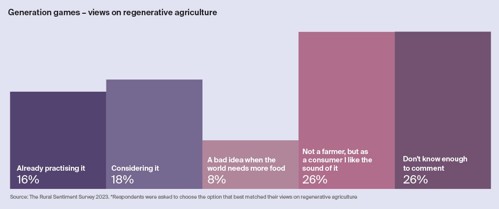 In our Rural Sentiment Survey, just over a quarter of respondents said they didn’t know much about regenerative agriculture and about a sixth are looking to practise it in the future. It can be the step into the unknown that puts people off trying a different approach.