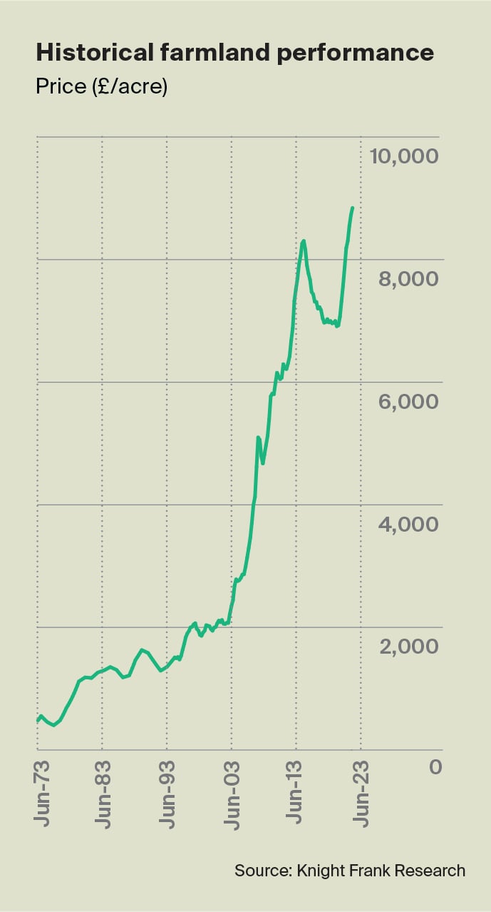 According to the Knight Frank Farmland Index, prices increased by just over 1% to £8,845/acre. Annual growth at 8% also slipped into single figures for the first time since the final three months of 2021.
