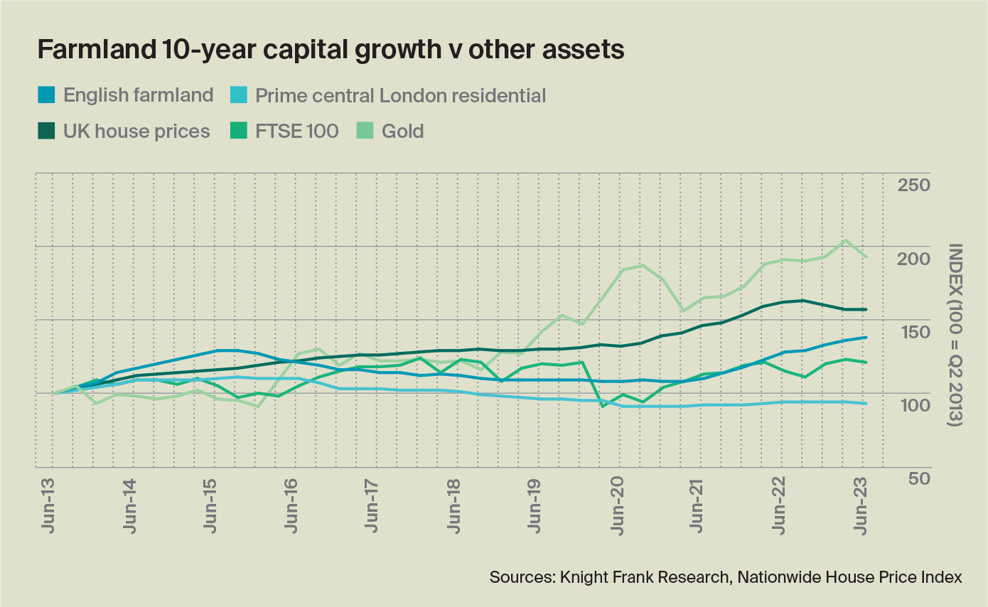 Farmland, however, has outperformed the FTSE 100 equities index, gold, prime central London houses and mainstream house prices over three and 12-month periods. Over five years, only gold has seen stronger capital appreciation.
