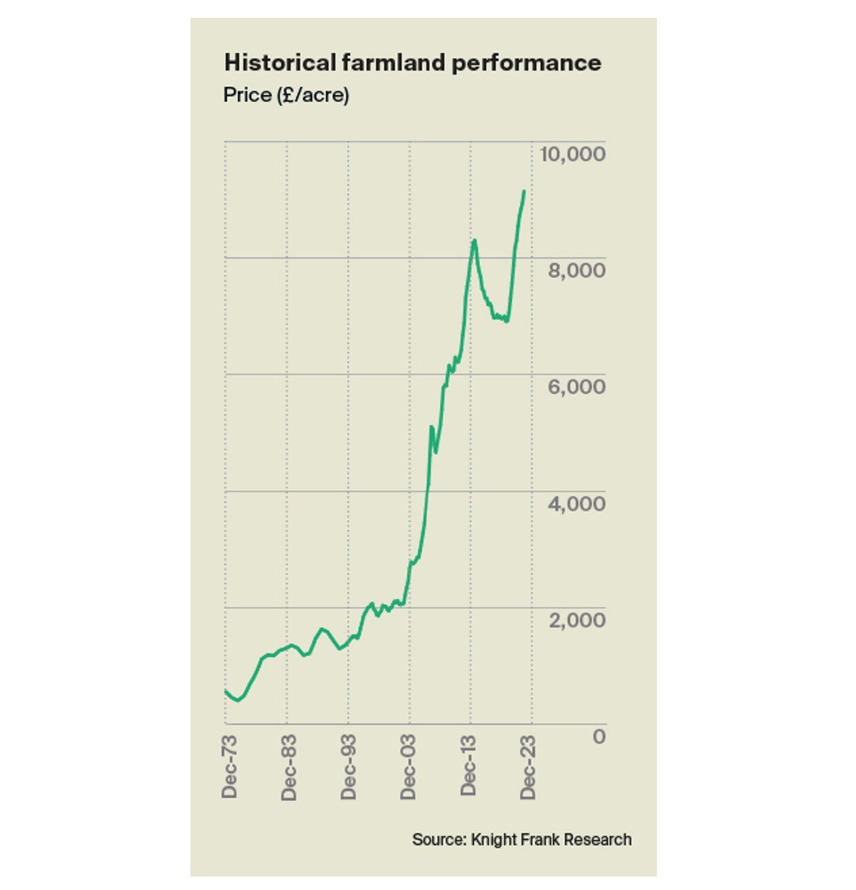 Agricultural land ended 2023 on a high with the value of the Knight Frank Farmland Index, which tracks the value of bare land (no houses or buildings) in England and Wales, rising by 2% in the final quarter of the year to break the £9,000/acre barrier for the first time.