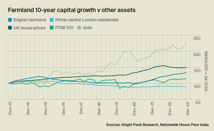 On an annual basis average farmland values increased by 7%, a performance that only gold could draw level with. The FTSE 100 equities index could only muster growth of 4%, while most house price indices fell into negative territory during the year.