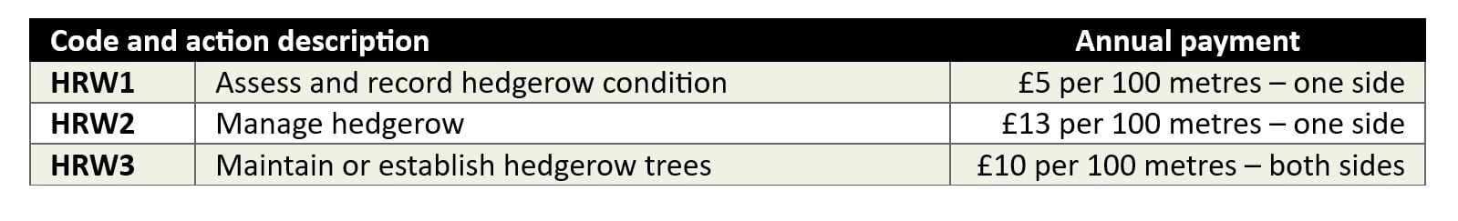 Let’s take a look at the options available under SFI 2023. Firstly, there are hedgerow management options that are available for all farms. Hedgerow payments are based on per 100 metres and either per side or both sides depending on the action.