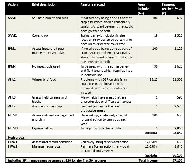 For this 100 ha block of arable land, the options in this example would return an income of £27,129 or £271/ha. This is higher than the Basic Payment Scheme payment (BPS) pre-tapering but before any costs involved in the implementation of any of the SFI actions.