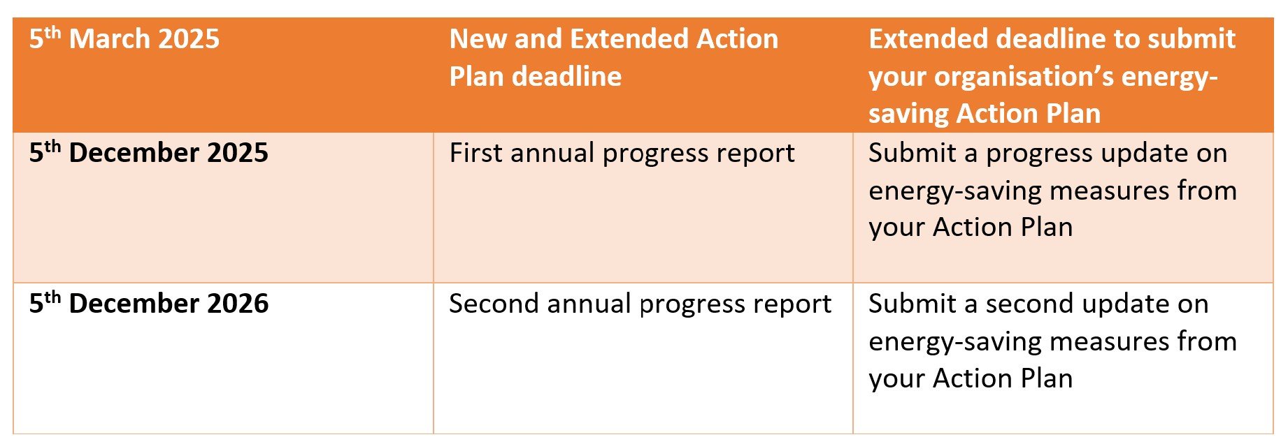 The Environment Agency (EA) deadline for the action plan has been extended to 5th March 2025, when organisations must outline measures to improve energy efficiency during the compliance period ending 5 December 2027.