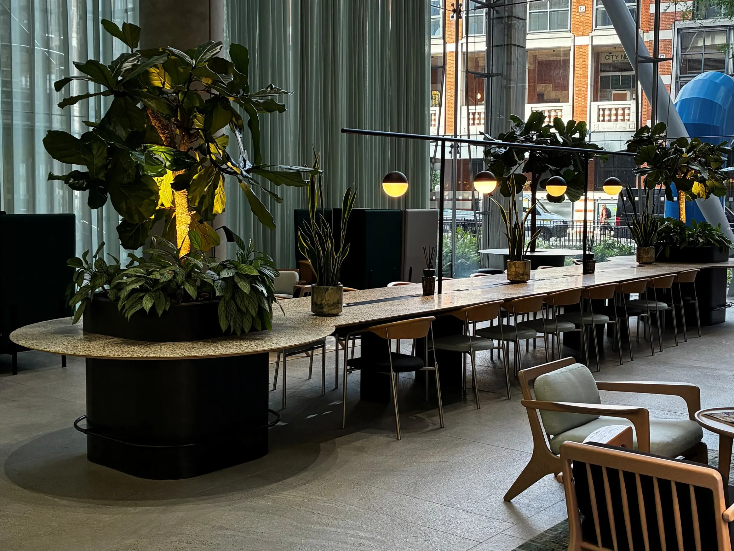 The reception was fully reimagined to create a contemporary arrival experience, complete with a new communal business lounge and café that encourages informal meetings and connection. A striking 83 sq m living wall now anchors the space, softening the architecture, improving indoor air quality, and bringing an “outside-in” atmosphere that aligns with the building’s character.