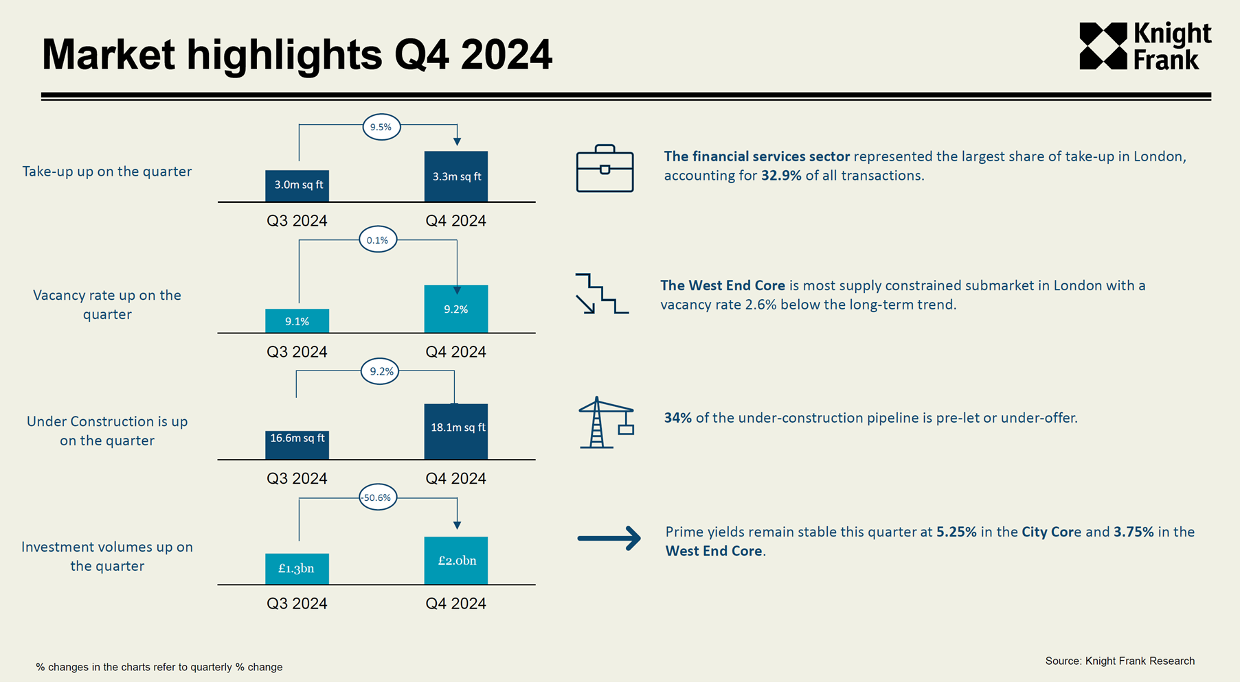 A: In Q4, prime yields remained stable, continuing the trend we've seen for a while. Pricing for prime London offices has held up well, with prime net initial yields standing at 3.75% in the West End and 5.25% in the City and Southbank.