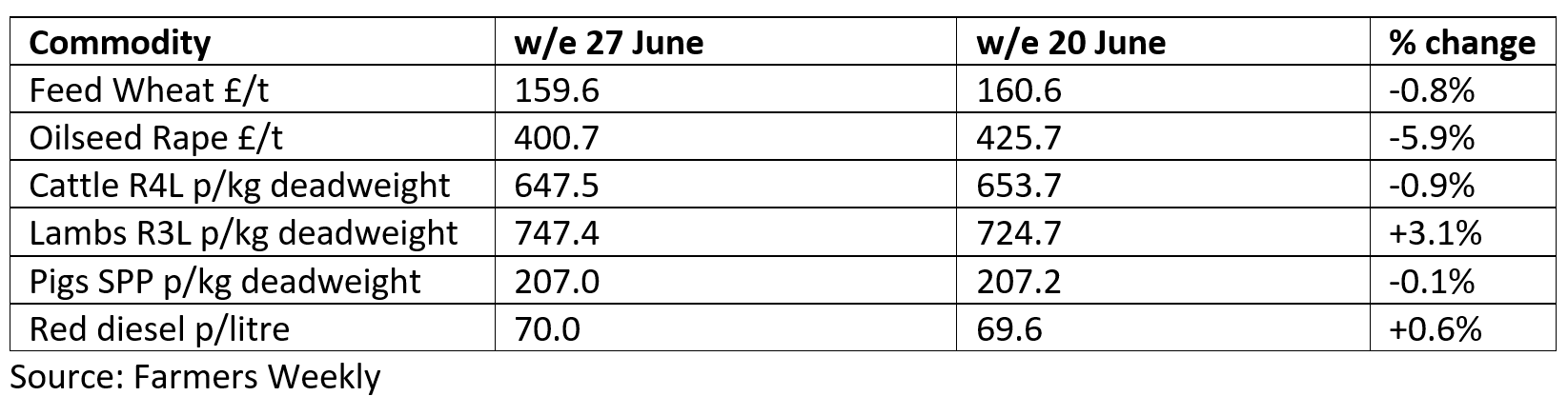 Warm weather meant combines were deep into the English barley crop before the end of June, a much earlier start than usual. Prices dropped slightly on the week to £143/t, about 6p/t lower than this time last year. Yields are predicted to be 10% lower than in 2024, with some quality issues expected for malting barley.