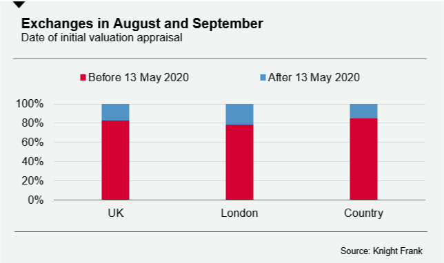 Almost two-thirds (65%) of UK transactions that took place over the two-month period were instructed for sale before the market re-opened on 13 May. Furthermore, 83% of exchanges originated from market valuations that were carried out before mid-May. In other words, the majority of sales that exchanged over the last two months were unconnected to the post-lockdown burst of activity, as the below charts show.