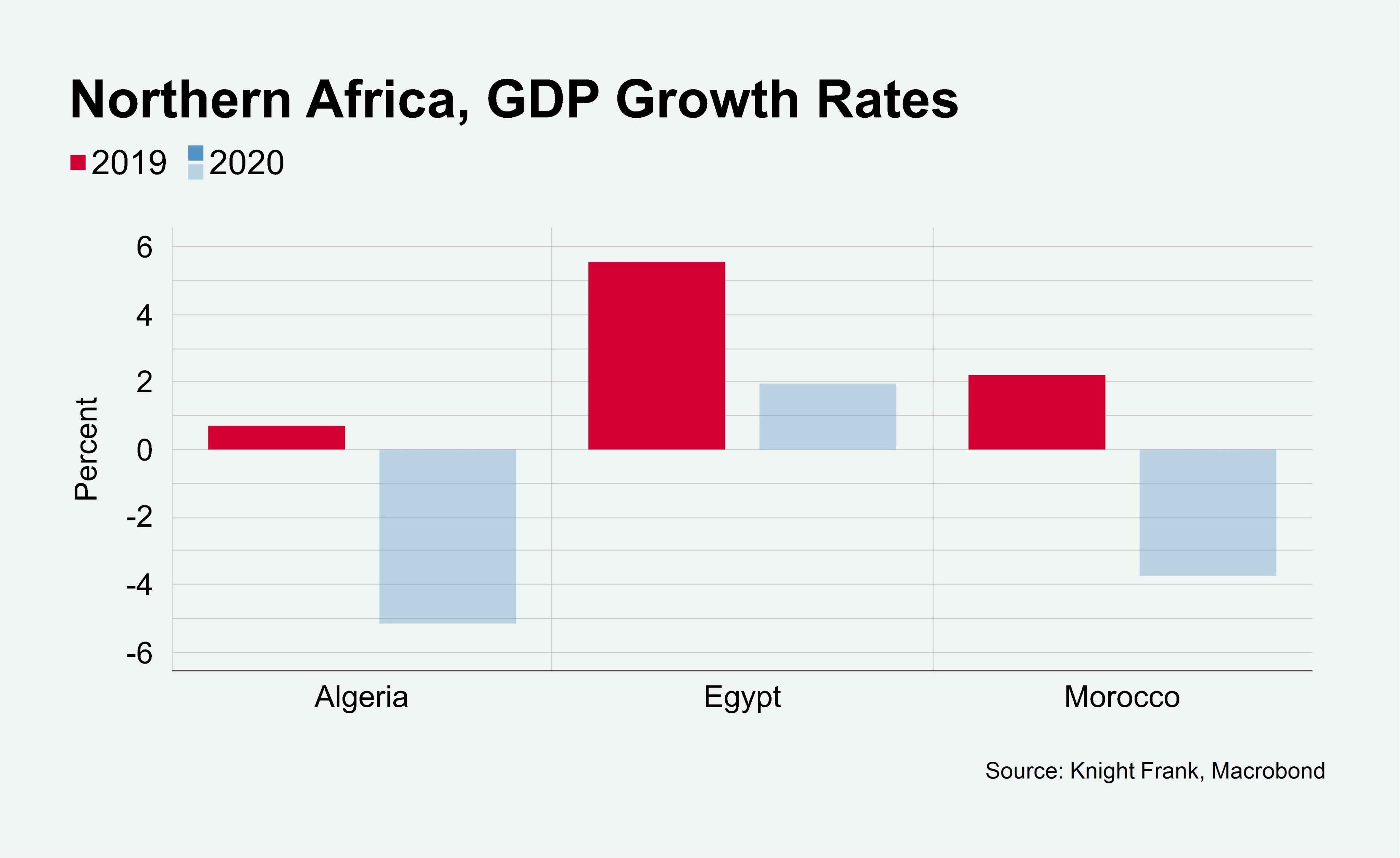 In Morocco, residential transactions have been halted as a result of the closure of notary offices due to the imposition of lockdown measures. Rents in the sector are expected to record slight declines of not more than 20% with the possibility of recovery by the end of the year. In the commercial sector, occupiers are looking to renegotiate their leases in order to obtain greater levels of flexibility. Rent defaults have primarily been recorded by small and medium occupiers, where these missed payments have been classified as debt rather than default as a result of government interventions. Furthermore, state-owned offshoring parks have offered the possibility of delaying payments or making monthly payments. We expect rents will decline slightly by not more than 10% due to the limited supply in prime offices.