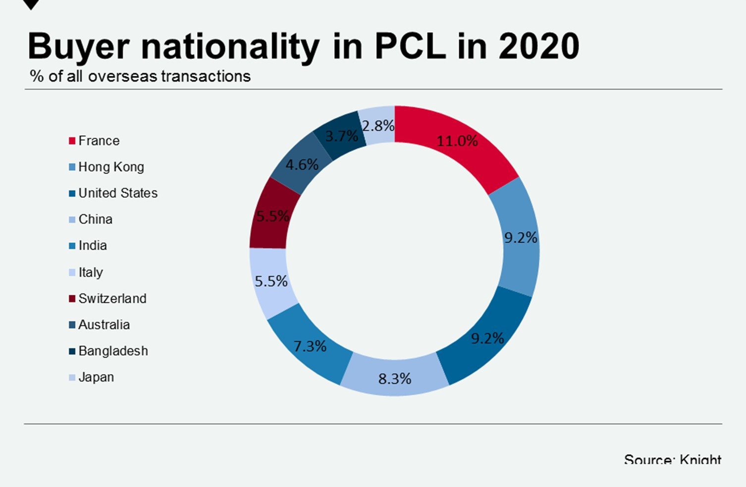 Chinese buyers have dominated in recent years and accounted for 15% of overseas transactions in PCL between January and September 2019, while French buyers represented just 2%.