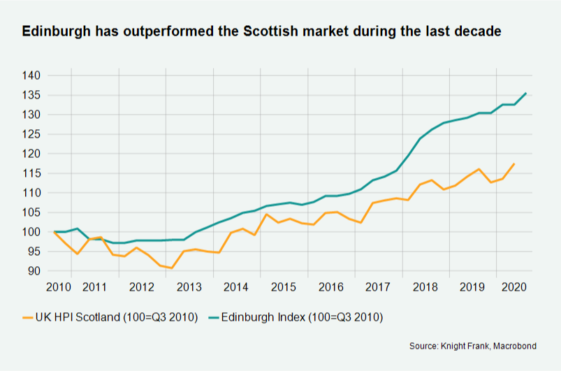 Property values in Edinburgh increased by 2.3% in the three months to September. This was the strongest quarterly increase since Q2 2018, pushing the Knight Frank Edinburgh City Index to its highest point since inception in 2008. Values were up 4% on an annual basis in the third quarter.