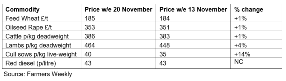 Oil seed rape prices, on a roll following a jump in global soya demand, were further supported by the reopening of the Erith oilseed crushing plant in Kent that had been shut following a fire in June. Interestingly, prices for all three red-meat sectors seem to be holding up despite the closure of restaurants and pubs during the latest Covid-19 lockdown.