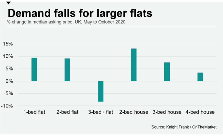 The median asking price of a three-bedroom-plus flat dropped 8.7% between May and October in the UK, an analysis of OnTheMarket data shows. It was the only property type analysed to record a decline over this period, as the below chart shows. Meanwhile the median asking price for a two-bedroom house rose 13.2%, the largest such increase, indicating how demand has shifted. See bottom for full numbers.