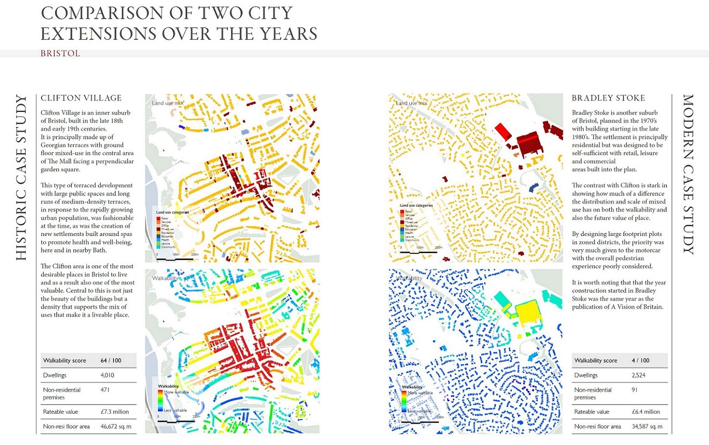 Computer modelling can map every-day, non-residential uses and then measure how far they are from people’s homes. The ‘Walkability’ heat maps in the report describe the degree to which newer settlements have succeeded, or not, to emulate the lessons of historical places. By analysing each building in turn, it is possible to identify how many different every-day land uses are within a 5-minute walk.