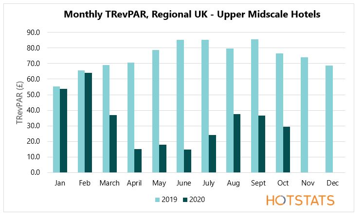 - The month of October witnessed a sharp decline in GOPPAR across all hotel datasets, with select service and upper-midscale hotels recording a 77% decline month-on-month, to less than £2.0 PAR and full-service upper and upper-upscale hotels both recording a loss for the first time since July.