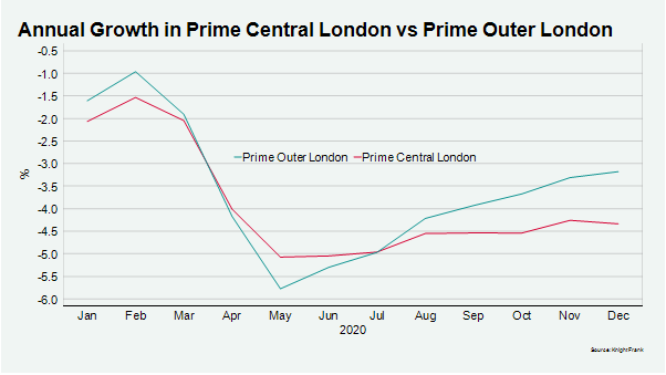 The difference between the annual price change in prime central and prime outer London was at its widest this year in December as Brexit-related uncertainty increased in the run-up to the end of the transition period.