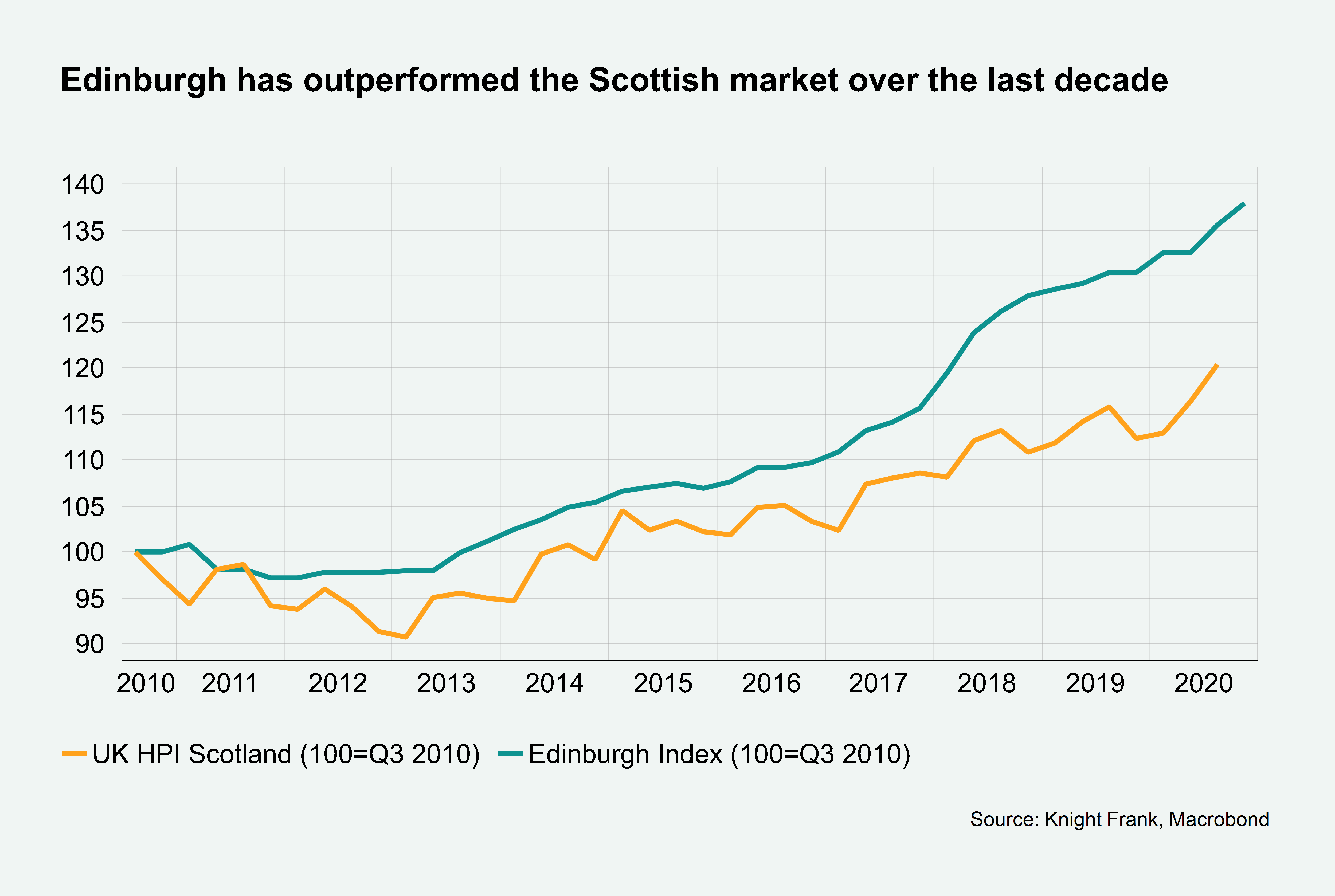 In the past ten years prices in Edinburgh have increased by 33%, which, along with the Midlothian region, has made it the fastest growing area in Scotland (2009 to 2019) according to the National Records of Scotland.