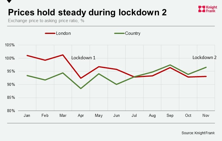 While prices dipped during the first national lockdown, there was no such effect in November. In fact, the average exchange price as percentage of the asking price in the country rose to 96.6% in November from 93.9% in October, underlining how demand remains strong. In London, the ratio was flat over the same period. The more dramatic impact that the general election result had on the London market is also obvious in the early months of 2020.
