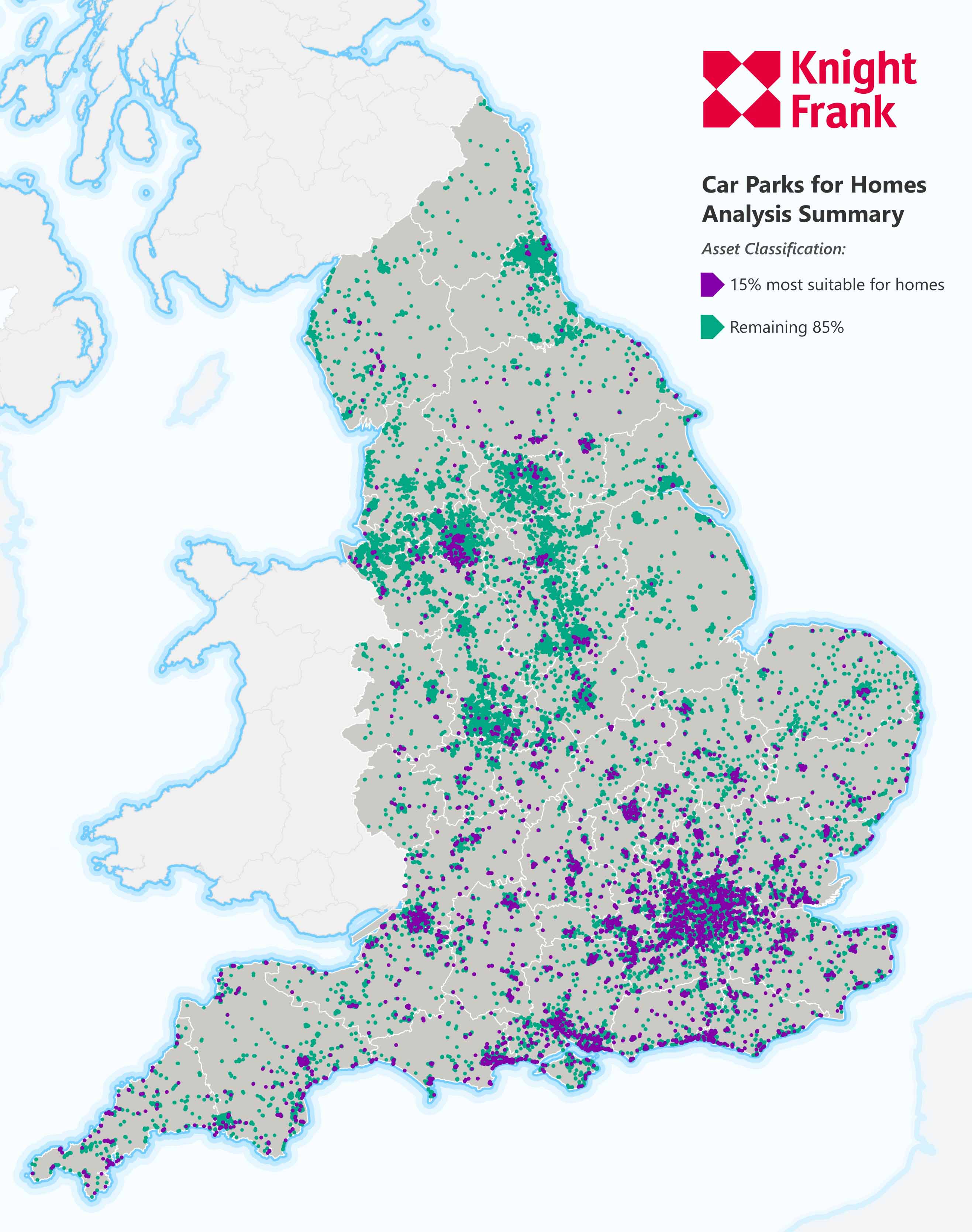 A good place to start could be looking at the extensive amount of potential development land tied up across England’s car parks, according to the results of a study by Knight Frank's Geospatial team, conducted on behalf of the Ministry for Housing, Communities and Local Government (MHCLG).