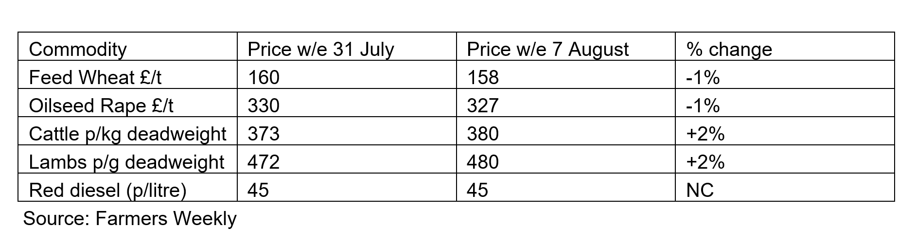 Arable prices weakened slightly on the week as more of the UK crop went under the combine. Values are still higher, however, than in 2019. Livestock prices edged up slightly, but in its latest report on the lamb market, the AHDB warns that a slower consumer recovery from Covid-19 and a disorderly Brexit will potentially weigh heavily on values later in the year.