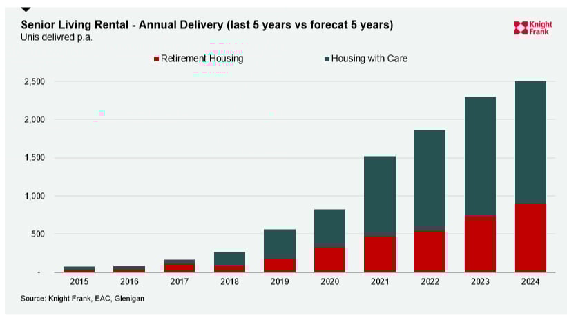 The number of private senior living rental properties in the UK is forecast to increase by 160% in the next five years, from almost 5,000 currently to more than 13,000 by 2024.