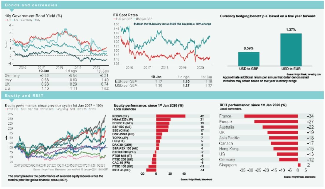 Currency: Sterling has appreciated to $1.37, while the euro is currently $1.21. Hedging benefits for US dollar denominated investors into the UK and the eurozone are 0.59% and 1.37% per annum on a five-year basis.