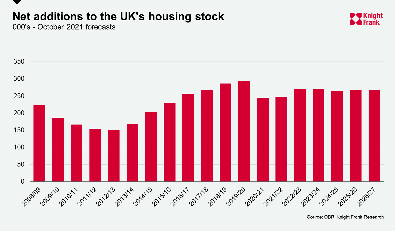 However, the OBR still expects overall net delivery for the whole of the UK to have peaked in 2019-20 at 293,500. This means the government will remain behind its target to hit 300,000 new homes a year for England alone for longer.