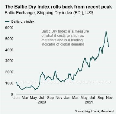 Brent Crude has increased to the highest rate since October 2018 at above $86/barrel, while West Texas Intermediate has seen trading at the highest price per barrel since 2014. Although the Baltic Dry Index, a measure of shipping costs for raw materials has declined by approximately 25% from its early October peak, it also remains well over 200% higher than the start of the year. These elevated prices are expected to support cost-push inflation over the coming months.