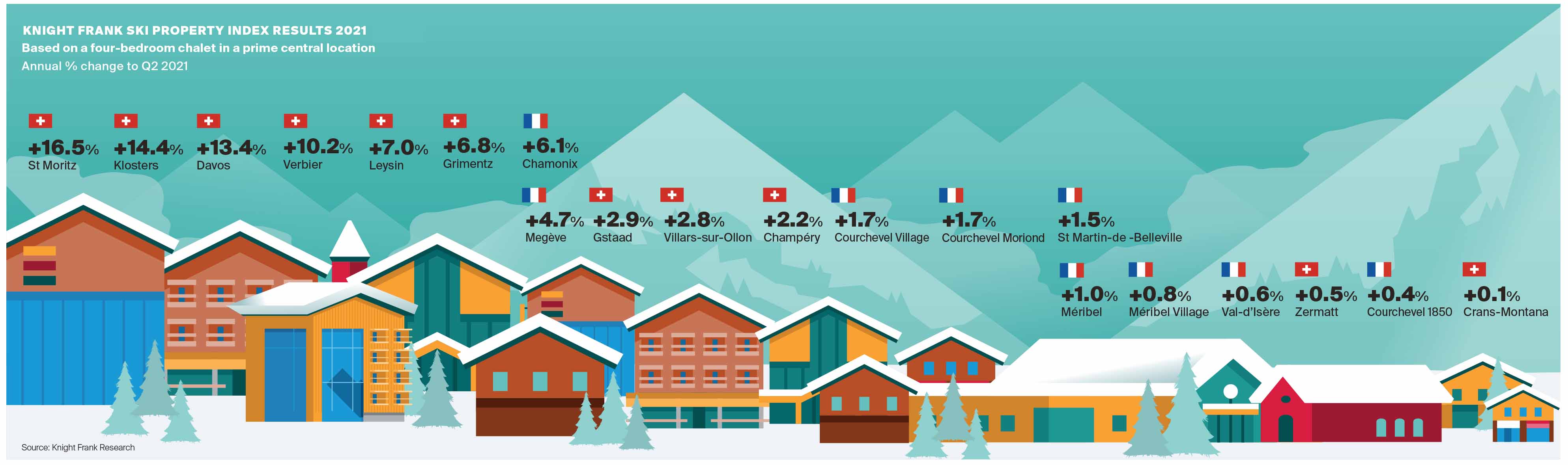 Knight Frank’s annual Ski Property Report, launched today, reveals that Swiss resort, St Moritz recorded strongest price growth in 2021 with property prices increasing by 17% according to the firm’s Ski Property Index.