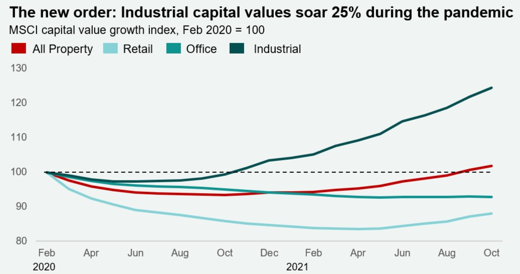 Chart of the day (see below) comes from Will Matthews: industrial capital values have soared 25% during the course of the pandemic.