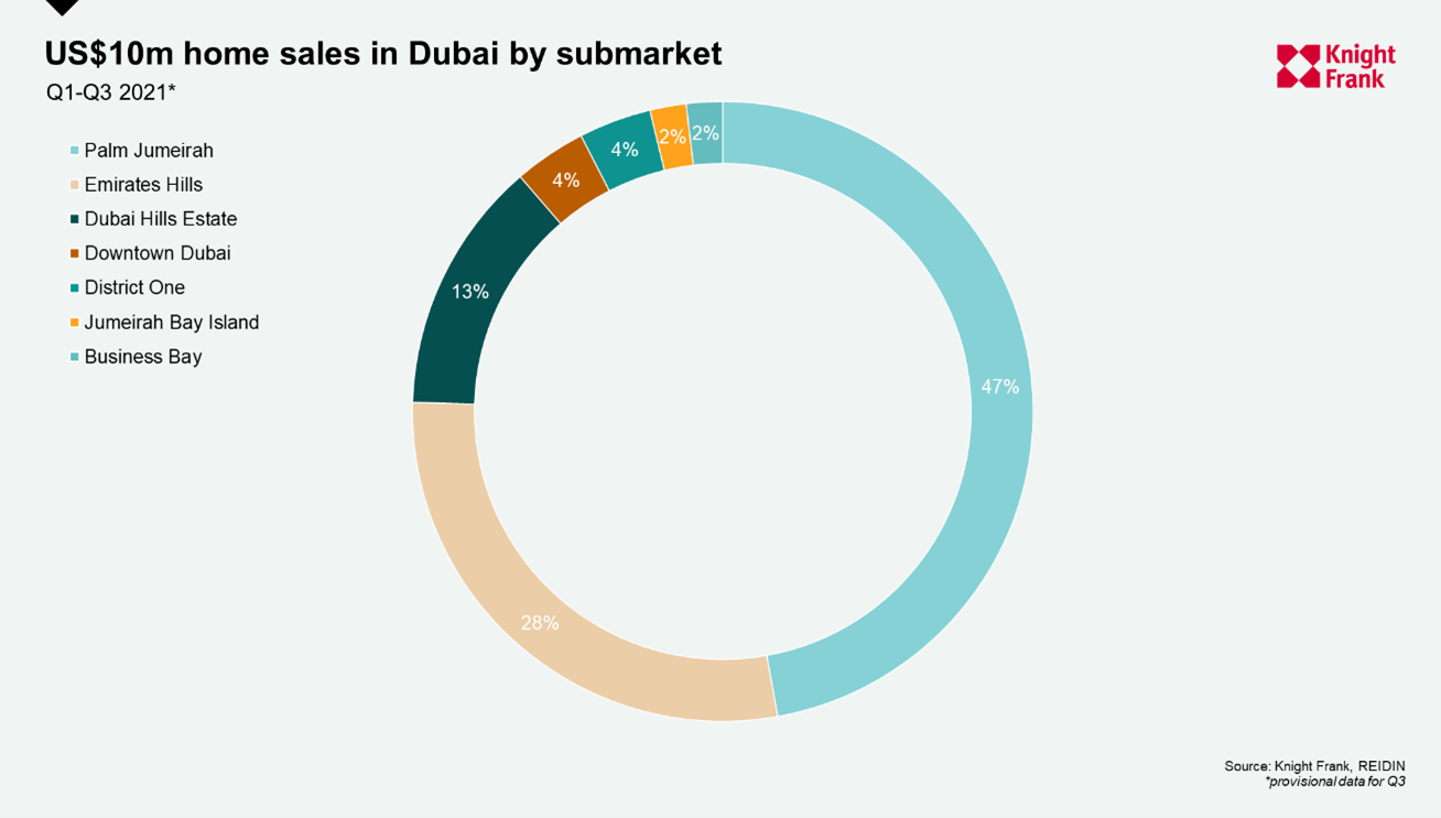 US$10m+ home sales in Dubai by submarket in 2021*