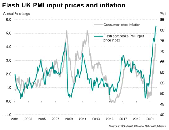 A new Purchasing Managing Index from IHS Markit, a leading indicator for the path of inflation, showed another record increase in firms' input costs during November. That suggests inflation will soon breach 5% (see chart).