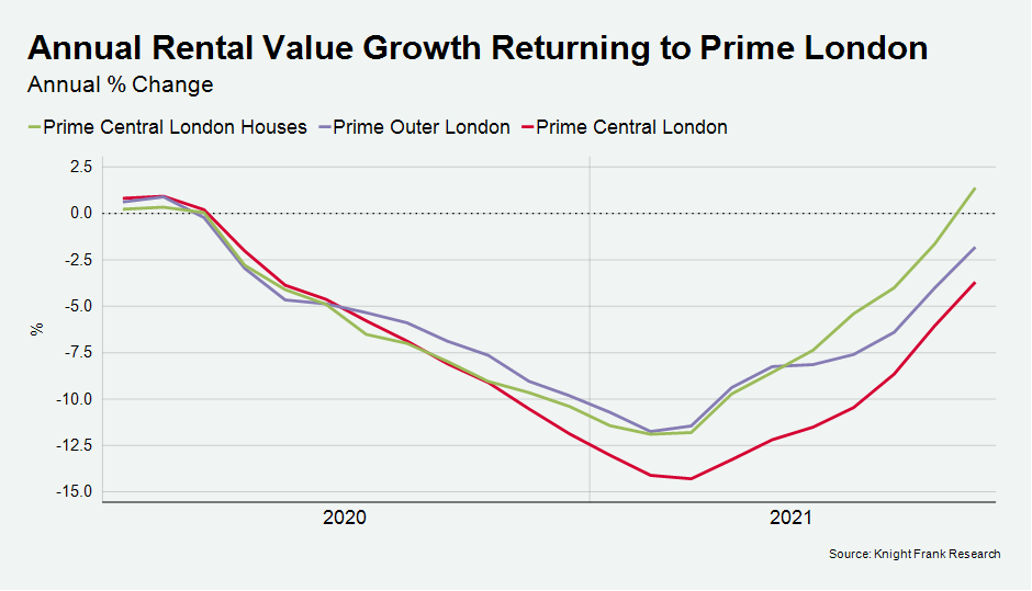 The annual decline in rental values in prime central London narrowed to -3.7% in October after bottoming out at -14.3% in March this year.