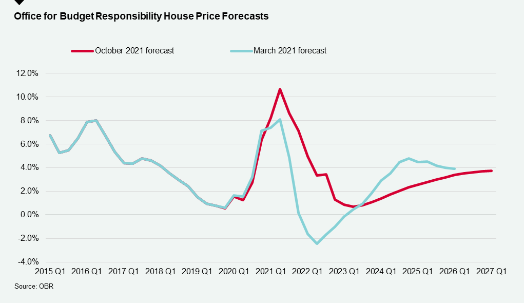 The OBR has also taken a more optimistic view of 2022 (see chart), expecting growth to slow next year to 3.2% rather than falling into negative figures. Previously, it had anticipated a price fall of 1.7% next year.