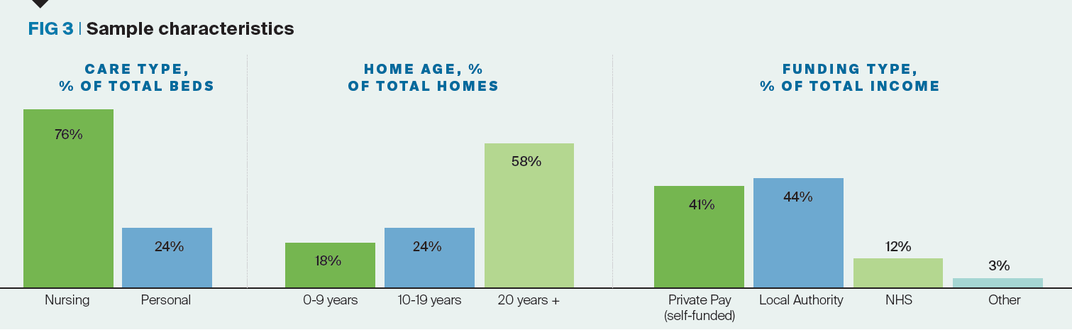 This year the sample represents just over one fifth of the care market. Whilst this is a significant portion of the sector, consistency and accuracy are key factors to consider whilst assessing the sample. Figure 1 shows the regional composition of the sample in comparison to the total UK market. The chart suggests that the sample is quite closely correlated with the exception of Northern Ireland and Wales, where the sample is slightly underweight.