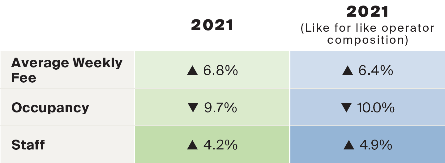 Average occupancy is down year on year from 87.9% to 79.4%, an expected result of the pandemic amplifying the usual issue of care home mortality rates. London saw the biggest occupancy decline, suffering a 15% fall, whilst Scottish occupancies proved to be the most resilient with a 5.9% reduction on the year.