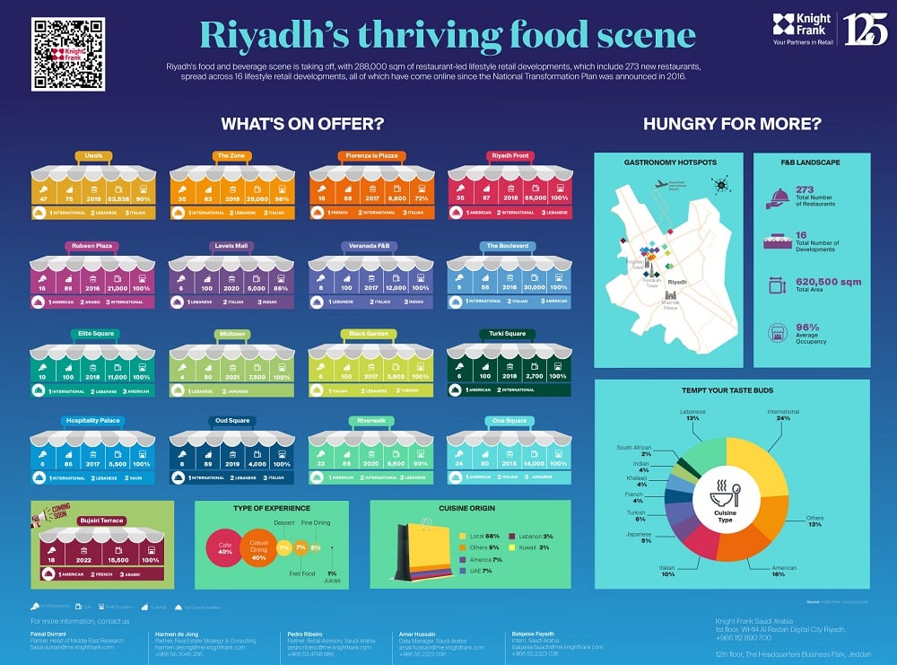 Riyadh’s food and beverage scene is thriving with 288,000 sqm of restaurant-led lifestyle retail developments, which include 273 new restaurants, spread across 16 lifestyle retail developments coming to market, since the National Transformation Plan was announced in 2016.
