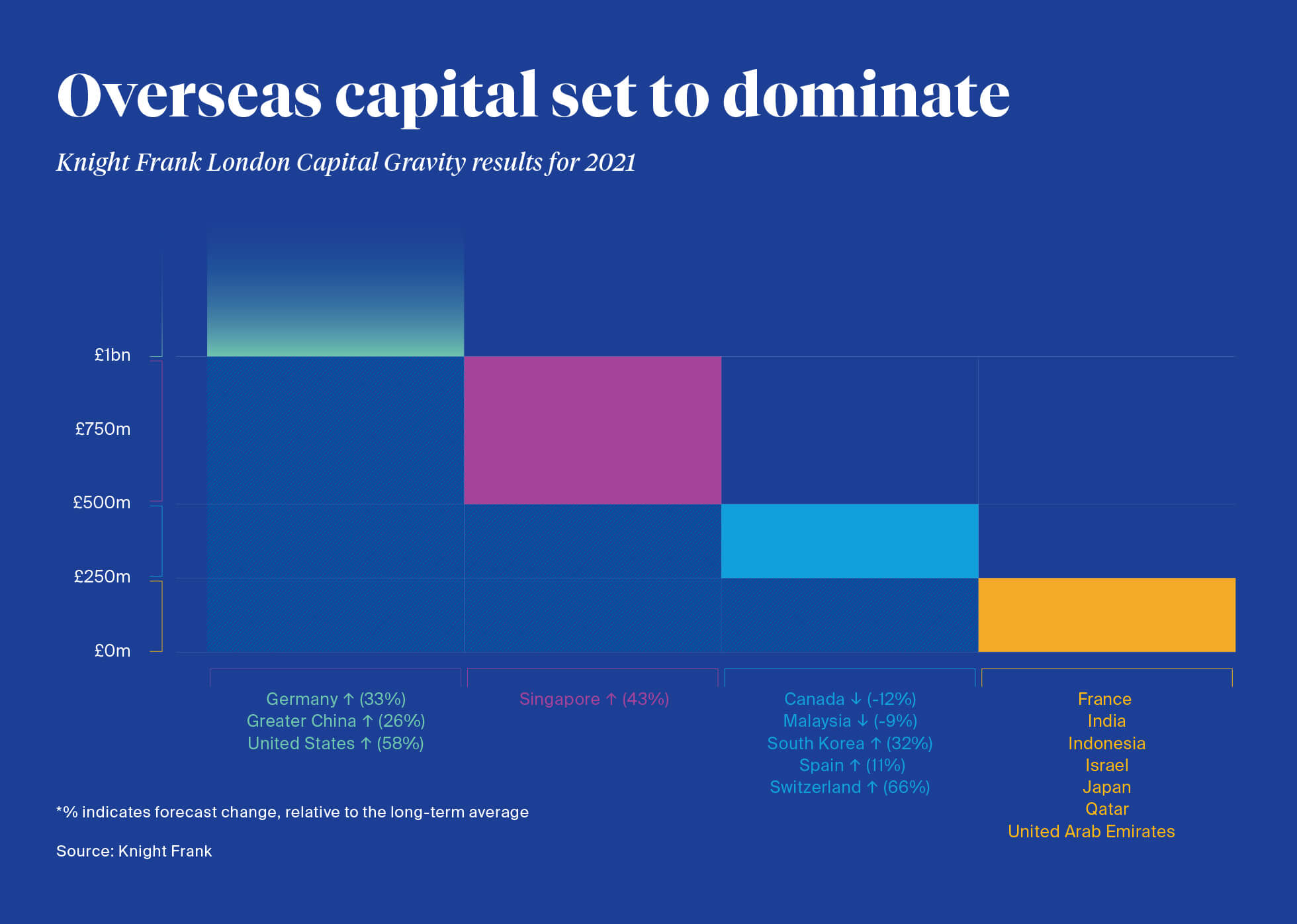 Using a bespoke “capital gravity” model, combined with our Knight Frank London investment data, we have forecast the likely source of flows of capital into London.