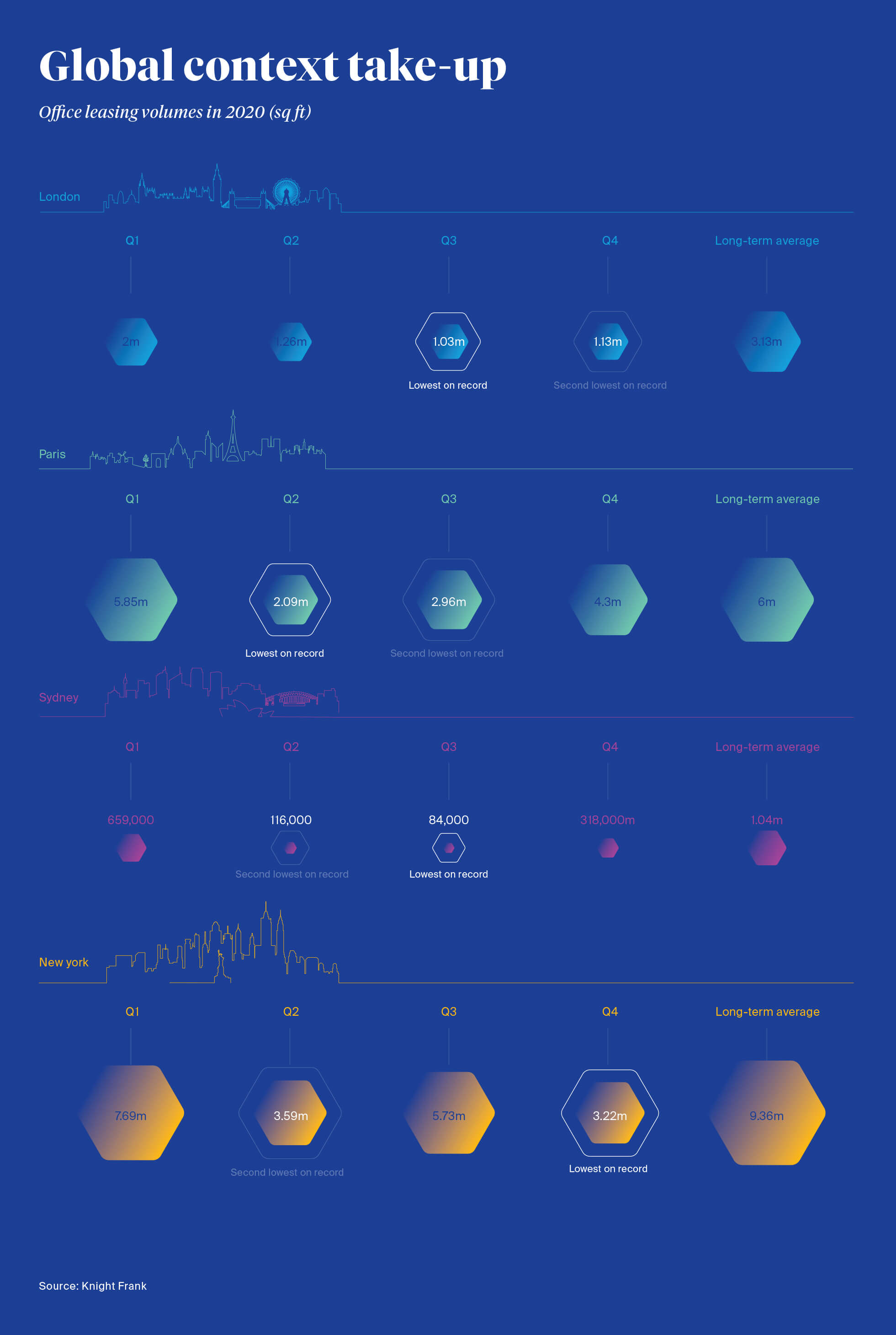 Leasing activity in London’s office market seized up in 2020 for obvious reasons, with most businesses postponing decision-making where possible. This was not unique just to London, with major cities like New York, Paris and Sydney all experiencing record low leasing volumes last year.