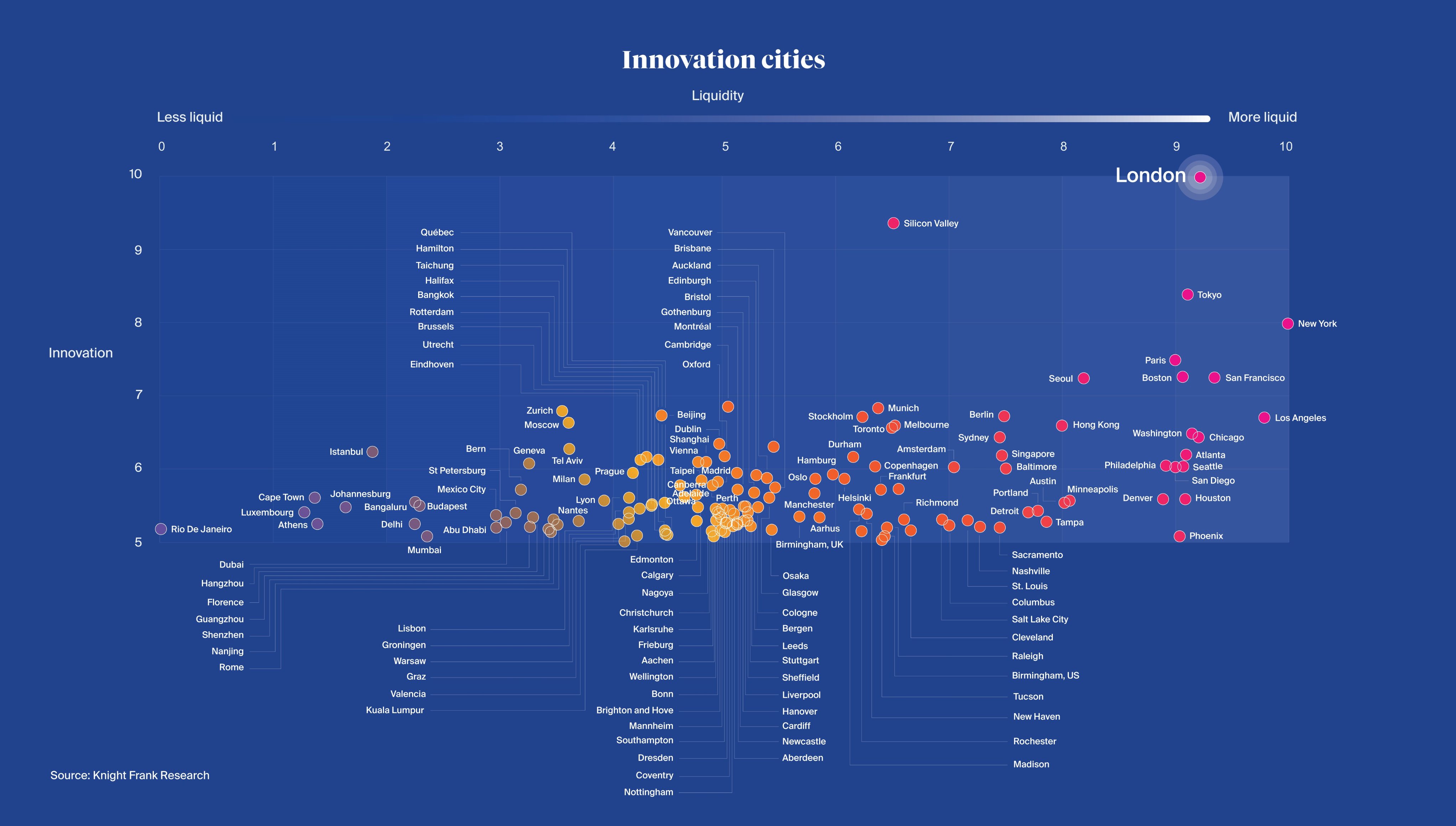 The cities in the upper half of the rankings are those with above-average innovation and liquidity scores. London leads the charge for innovation, followed by Silicon Valley, Tokyo and New York. These cities’ ability to attract cross-border investment is at least in part driven by their world-leading research facilities and strength of innovation. This is particularly true for London.