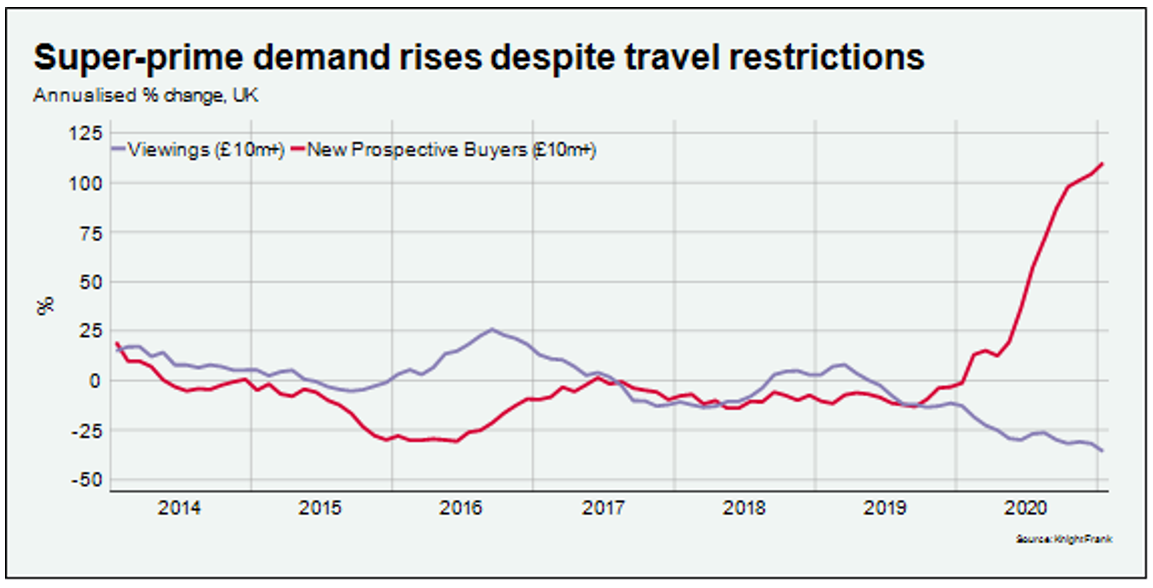 Viewings on UK properties valued at more than £10 million are falling at the steepest rate in a decade due to international travel restrictions. However, the number of new buyers registering is growing by the most in ten years.