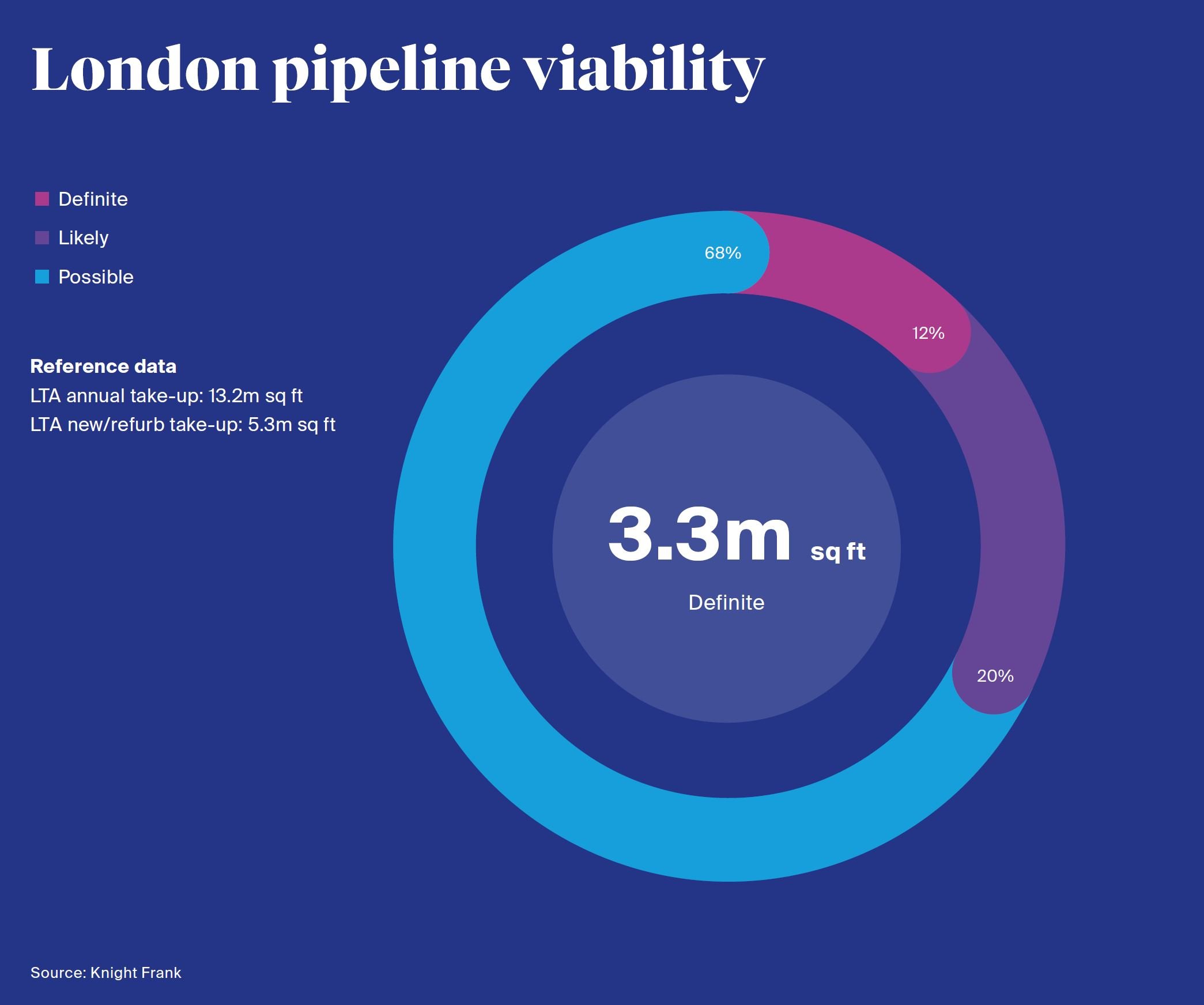 Based on an assessment of 26.6 million sq ft of pipeline stock, i.e. schemes not currently under construction across London and due to complete by 2036, we found that just 12.3%, or 3.2 million sq ft, fell into the “Definite” category; meaning that just 12.3% of the potential pipeline is likely to be delivered in the envisaged timescales. To put this into context, the long-term average take-up level for new and refurb space is 5.2 million sq ft.