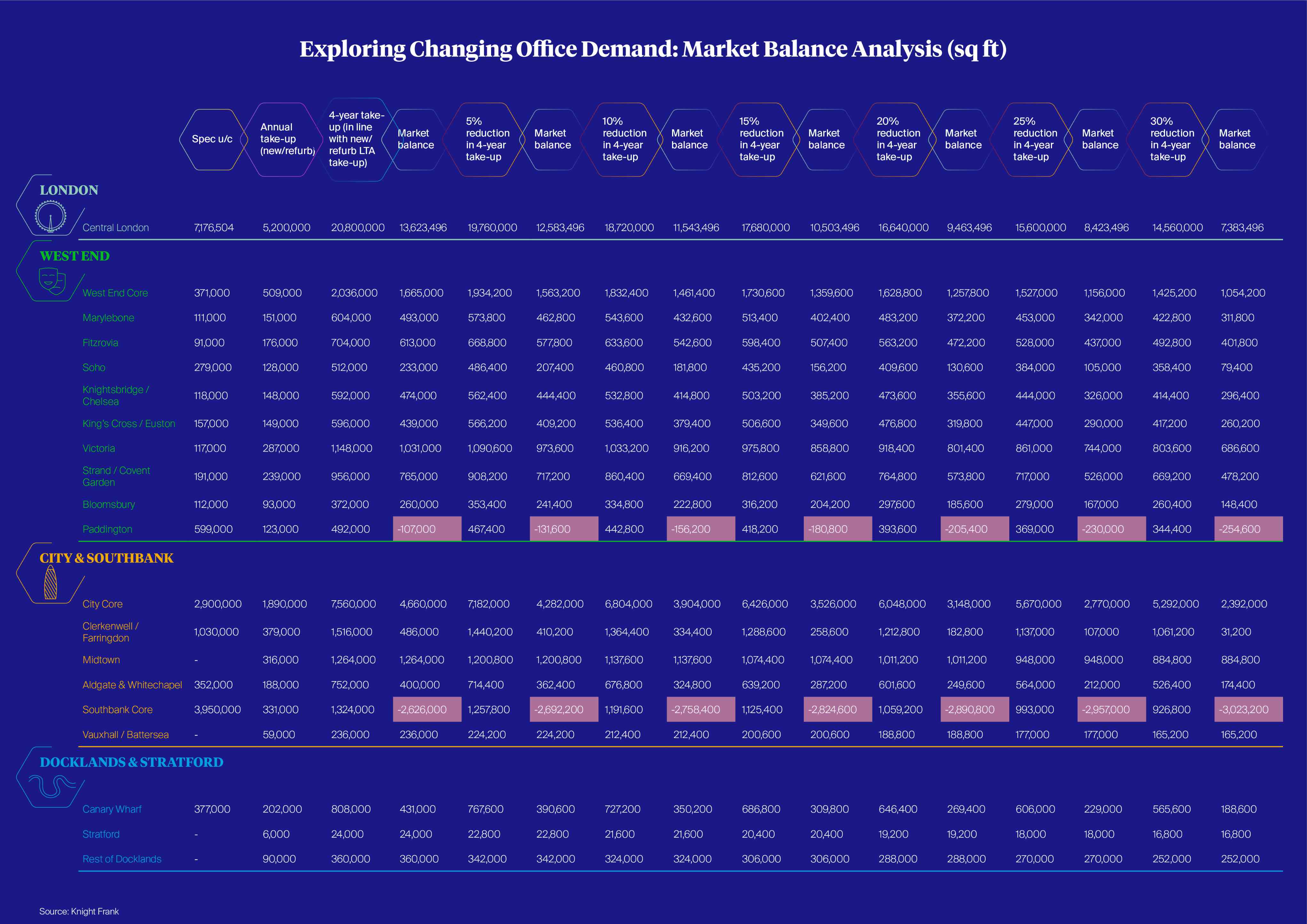 We have run various scenarios to assess the impact of a permanent change in occupier take-up behaviour. In every case, the amount of supply planned and indeed currently under development, falls short.