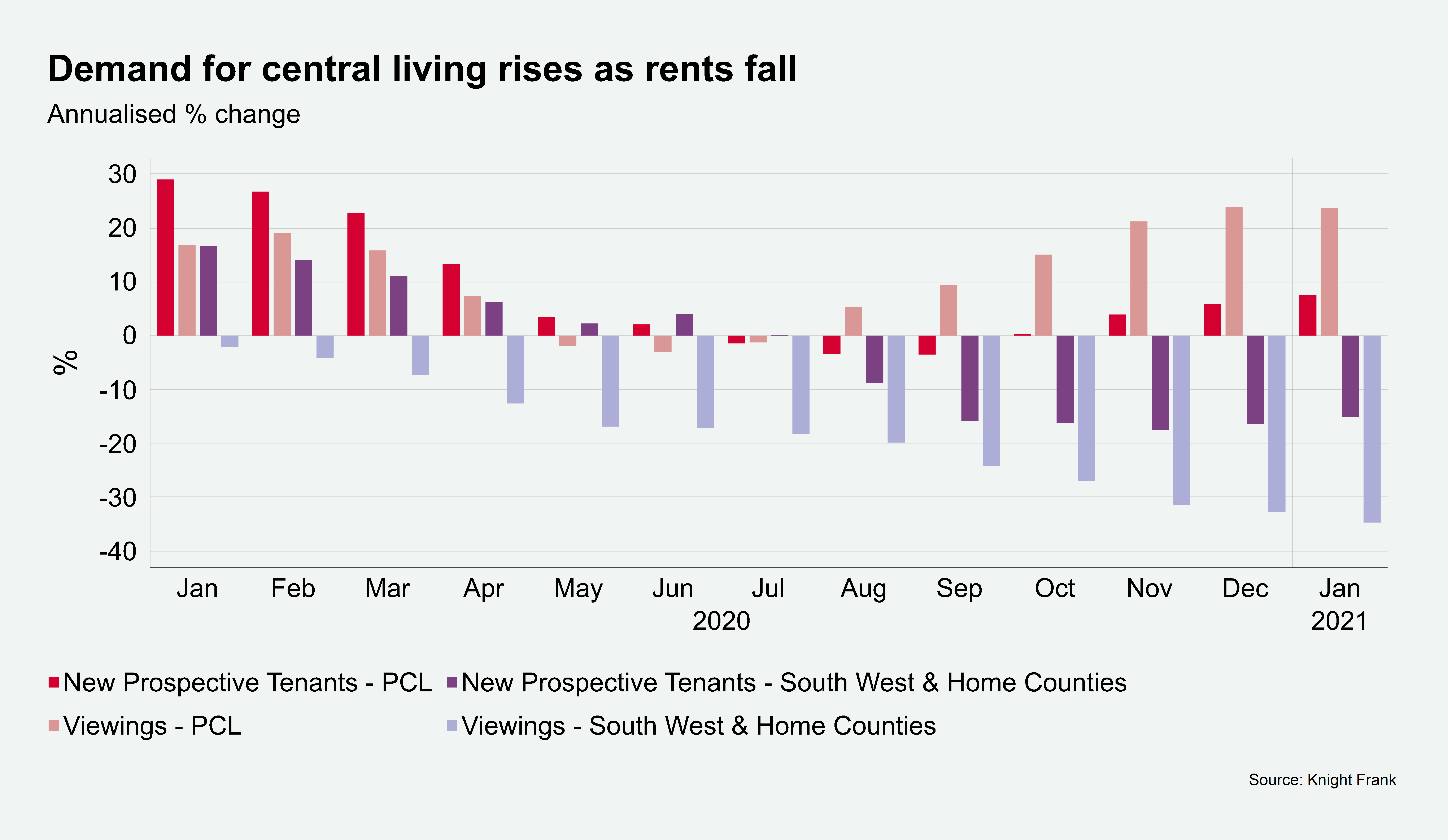 While the number of viewings in PCL rose 24% in the year to January 2021 versus the previous 12 months, there was a 35% decline in south-west London and the Home Counties. New tenant registrations were up 8% in the same period in PCL while the number declined 15% in south-west London.