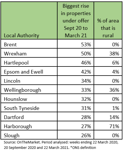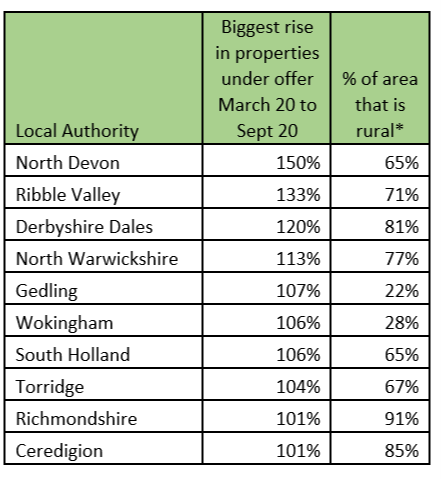 The three areas of England and Wales that experienced the biggest increase in the number of properties that went under offer over that time were North Devon, Ribble Valley and Derbyshire Dales, OnTheMarket data shows.