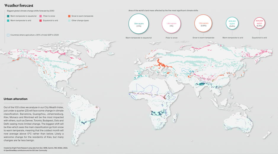 There are many ways to evaluate the potential risks and opportunities relating to investment portfolios, and the implications of climate change are increasingly part of the mix. In this article, the Knight Frank Geospatial Research team looks at the world through one particular climate-related lens to illustrate the kind of factors that investors could consider.