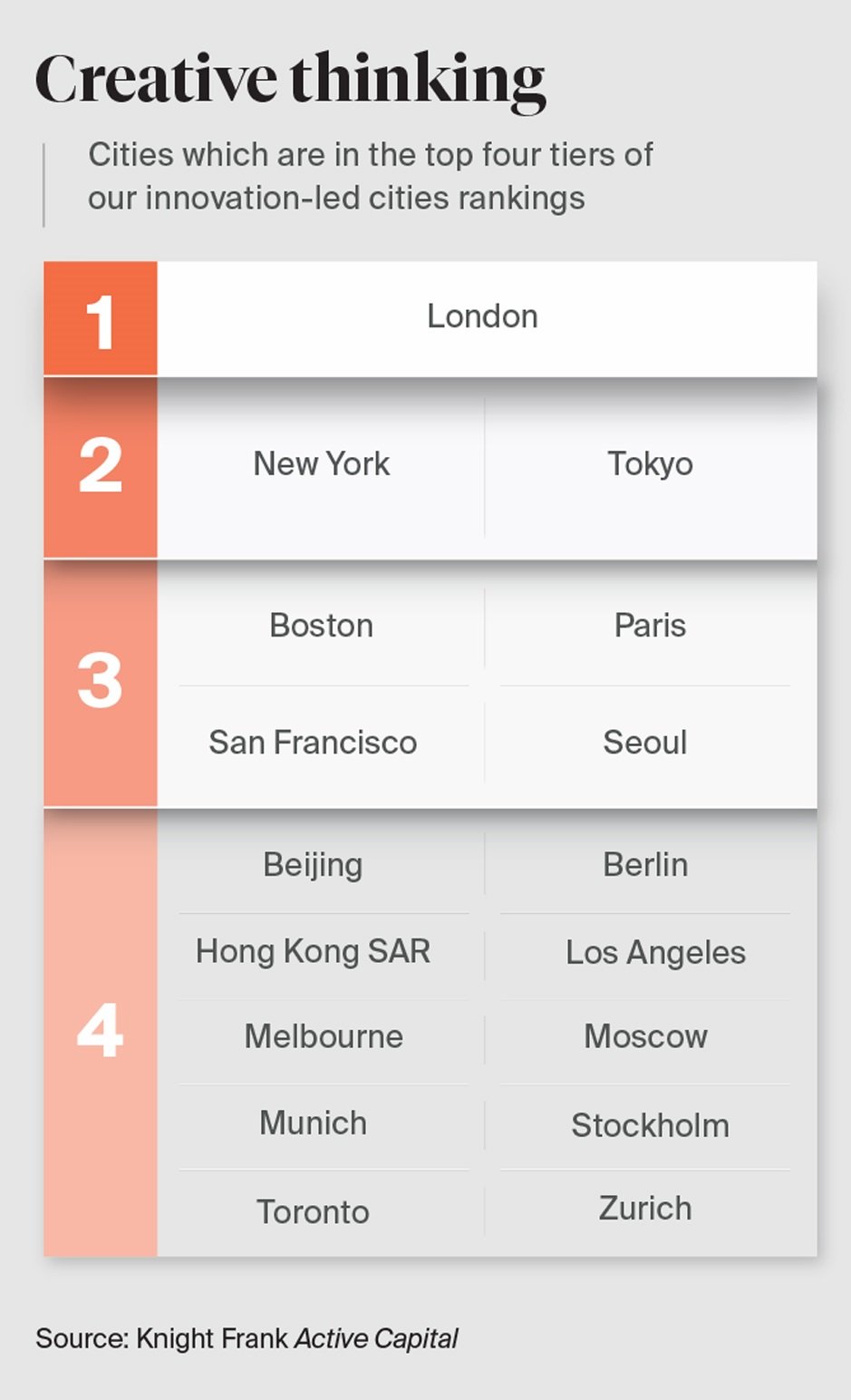 In our sister report Active Capital, which offers insights into the dynamics of global real estate capital markets, we identified global innovation- led cities that will attract and retain talent and wealth, creating future opportunities.