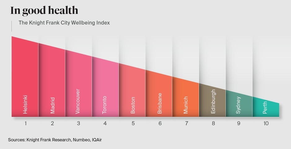 - Helsinki tops the list in the City Wellbeing Index, up from third last year, closely followed by Madrid and Vancouver