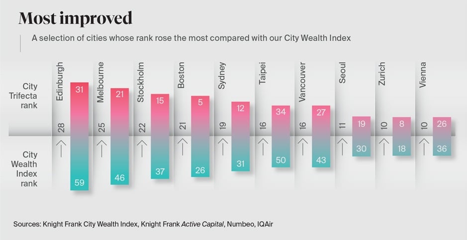 For example, when we factor in its city innovation and wellbeing rankings, Munich takes top spot in the Trifecta, compared with ninth place in the City Wealth Index. Tokyo climbs to second from fourth.