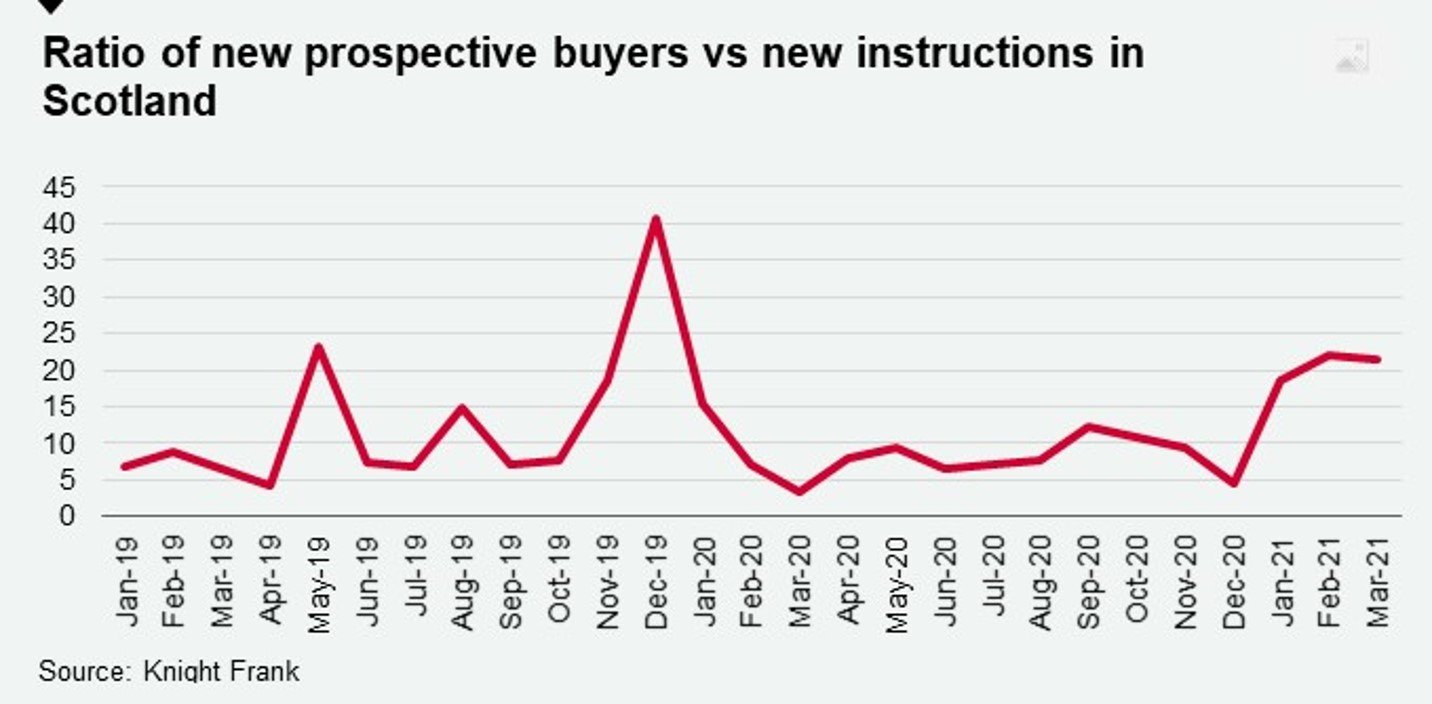 This has left Scotland facing an imbalance between supply and demand. While new prospective buyers increased by 28% in Q1 2021 compared with the five-year average, in the number of sales instructions were down 11%.